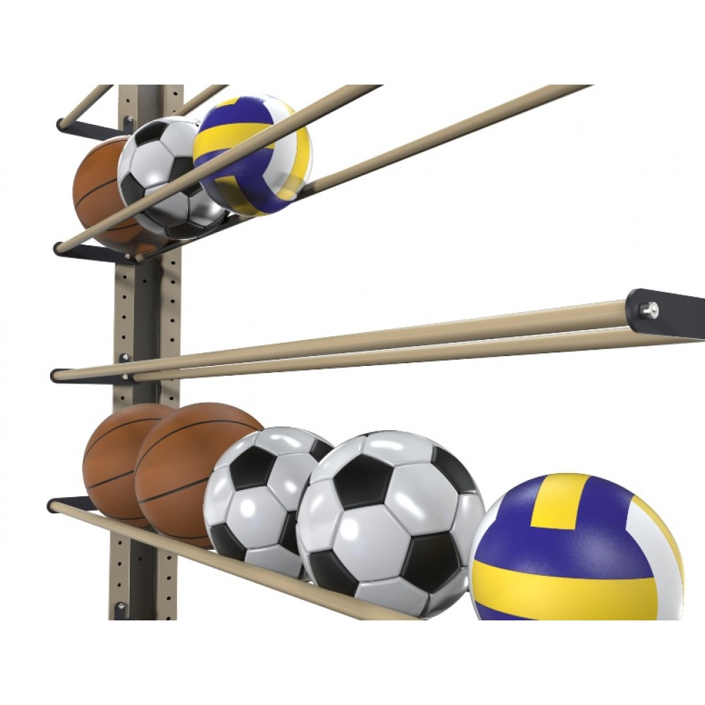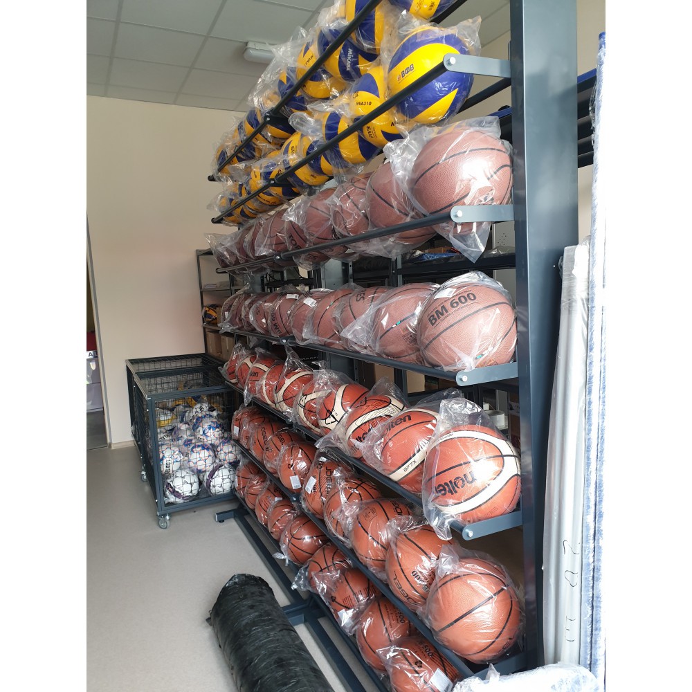 Конструкция стеллажей сборно-разборная, имеет регулировку горизонтальных держателей-полок с шагом в 5 см., что позволяет настраивать расстояние между полками под различный вид и диаметр мячей. По желанию Заказчика, в целях увеличения мест хранения, возможна дополнительная закупка полок.