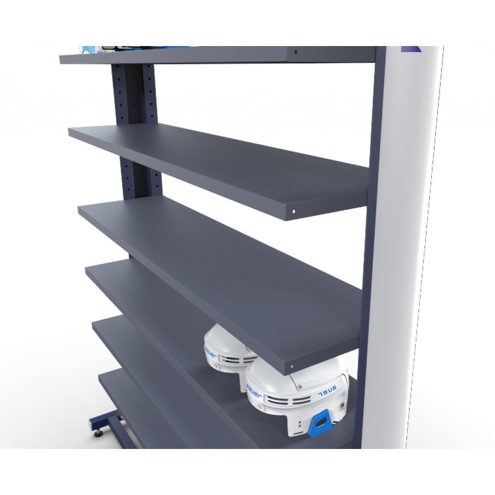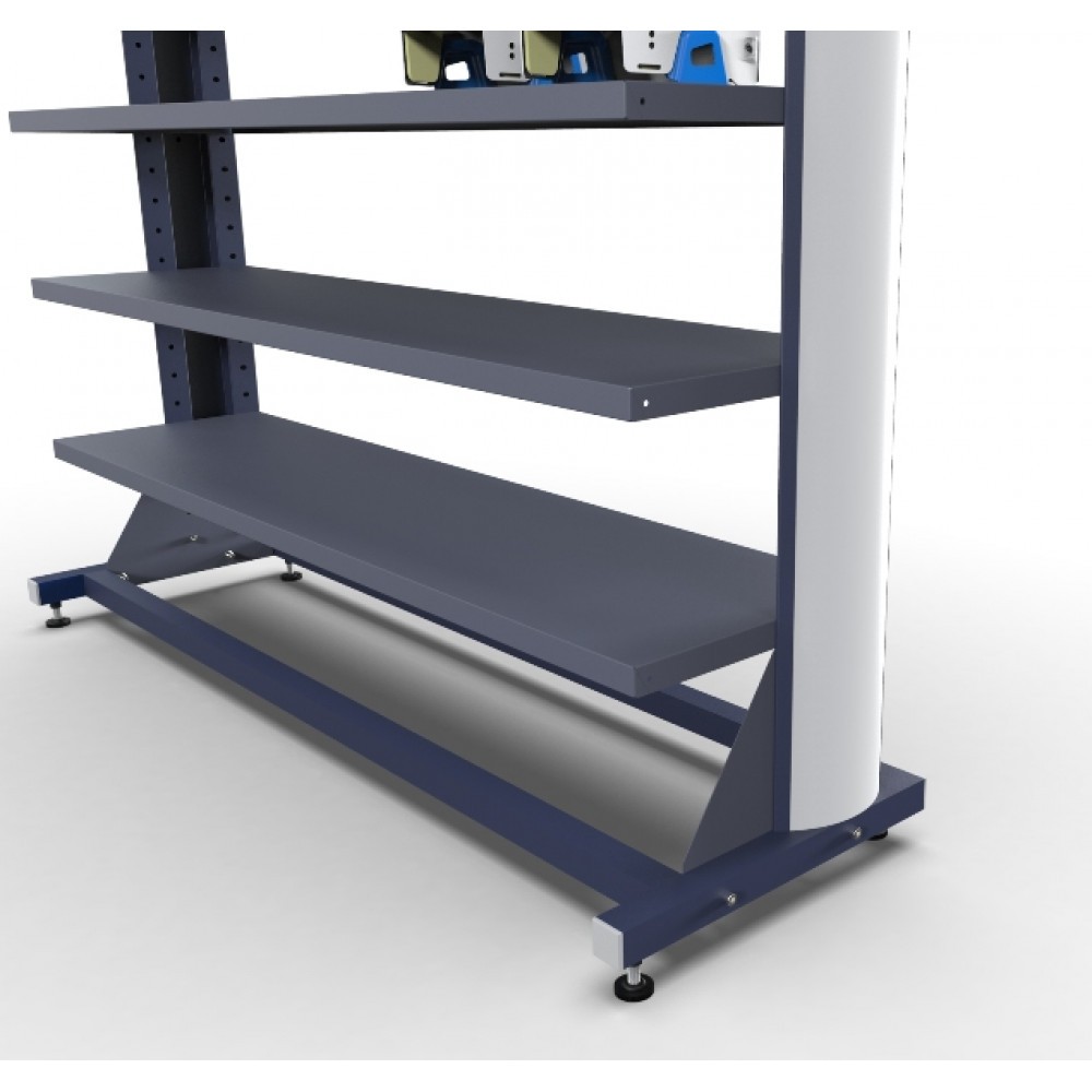 В боковых стойках стеллажа установлена декоративная пластиковая панель, толщиной 2 мм. Данная панель предназначена для нанесения индивидуального дизайна или логотипа и с лицевой стороны закрывает элементы крепления. В базовой комплектации, стеллаж установлен на винтовые опоры. По желанию Заказчика стеллажи можно укомплектовать колесными опорами или поставить на рельсовую систему, также, дополнительно, возможно установить панорамную пластиковую панелью размерам В.2250 * Ш.670 мм., с изображением и ручку для удобного перемещения. Оборудование окрашивается полимерным порошковым покрытием с высокими защитными и декоративными свойствами. По желанию Заказчика, возможно, покрасить стеллаж в любой цвет по палитре RAL. Так же возможно изготовление стеллажа по индивидуальным размерам Заказчика.