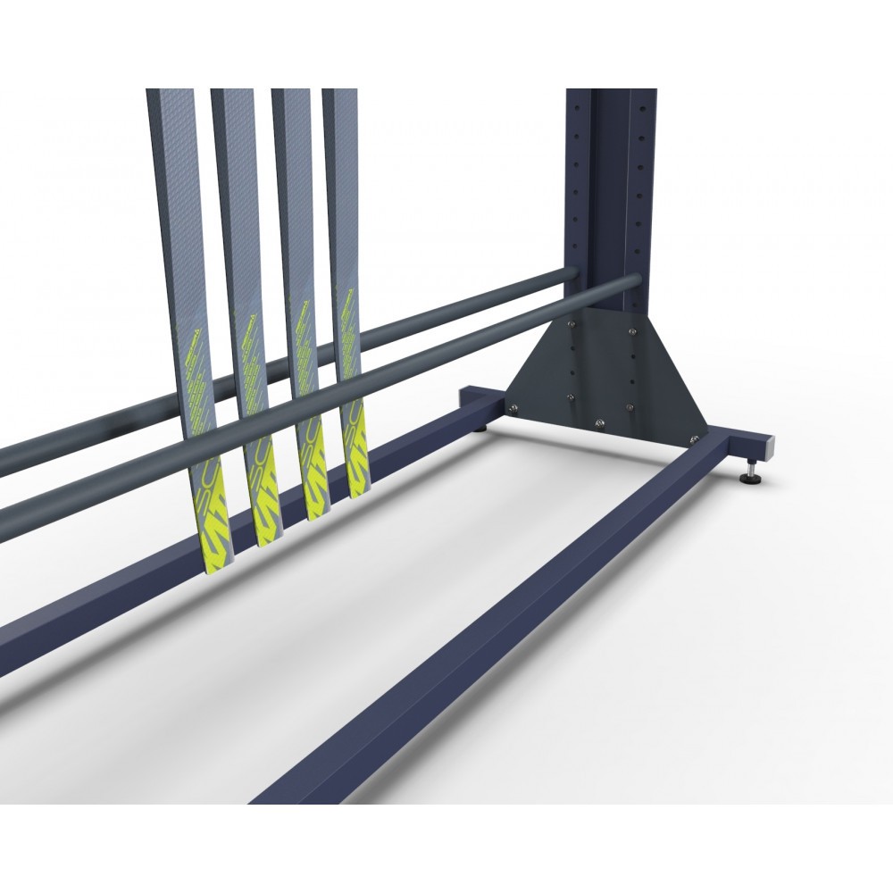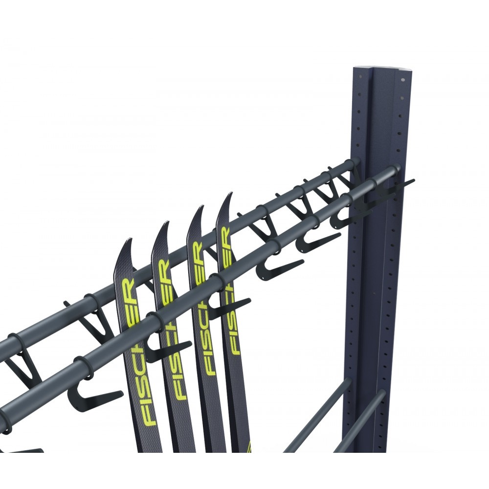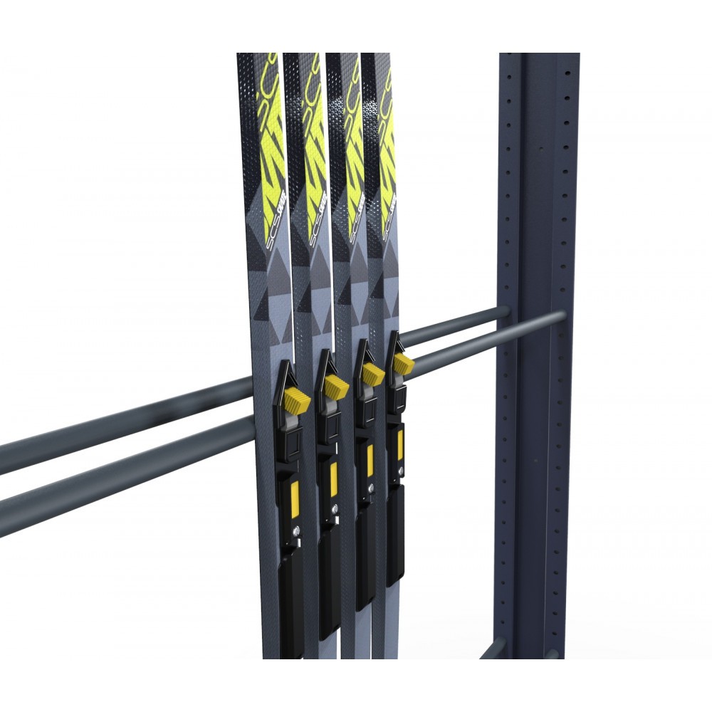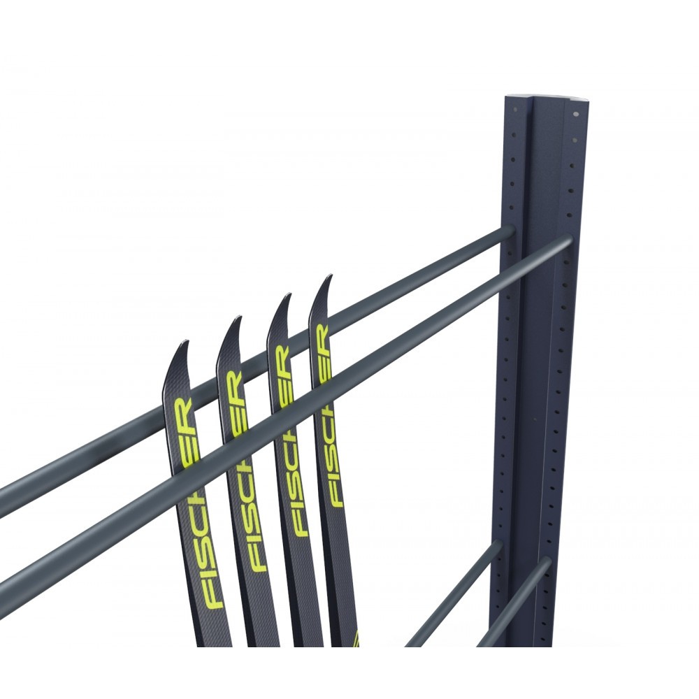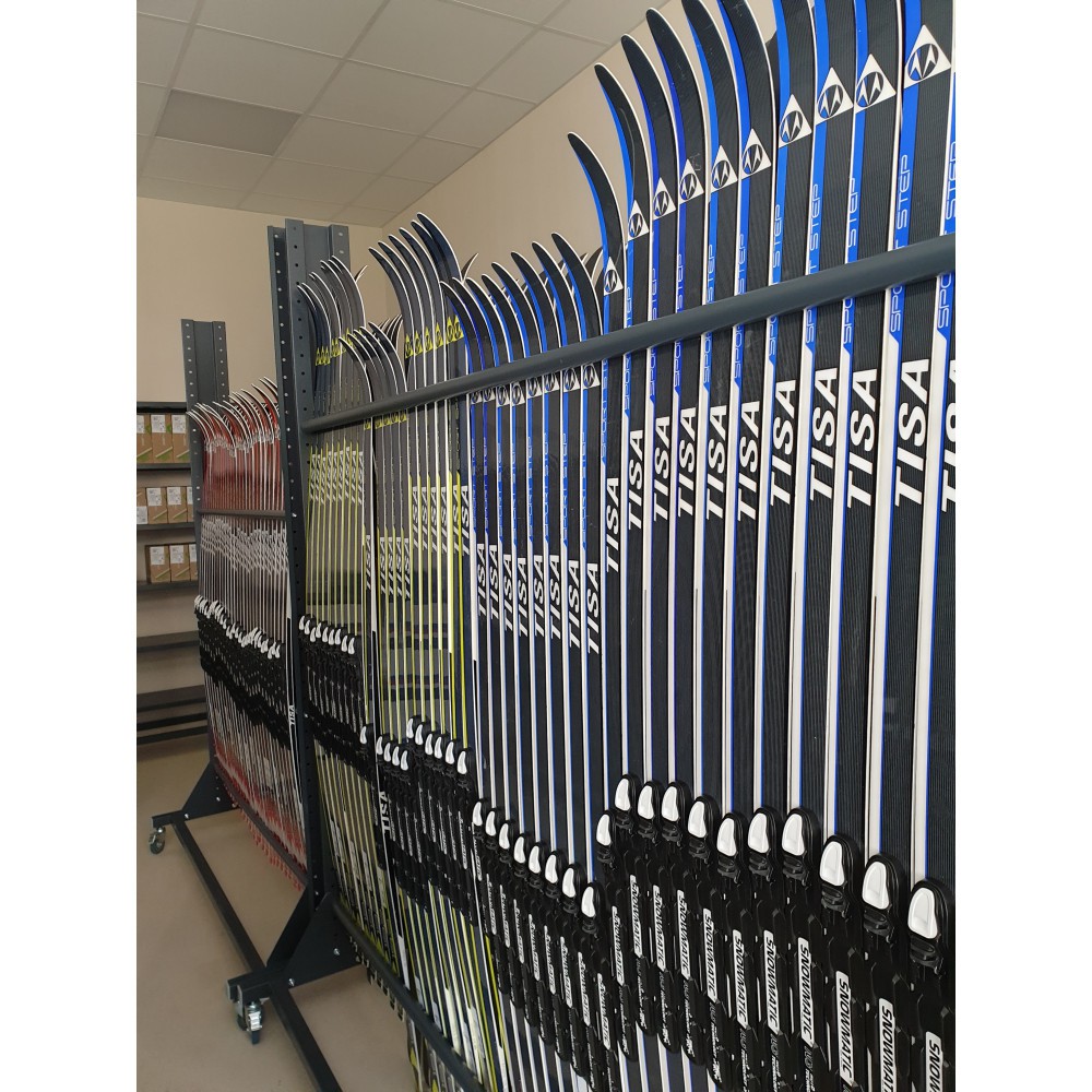 Стеллажи для беговых лыж обладают сборно-разборной конструкцией. Благодаря регулировке горизонтальных держателей лыж с шагом в 5 см., возможна установка лыж различной длины: взрослые (170-210 см), подростковые (145-180 см) и детские (100-170 см).