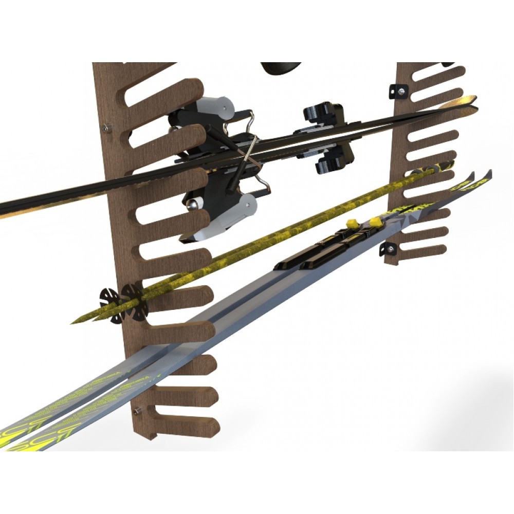 Вешалка SE-7/18 предназначена для хранения сноубордов различной длины и конфигурации, так же возможно хранение как беговых лыж разных типов и размеров, так и горных лыж и лыжных палок. Конструктив данной вешалки предусматривает одностороннее размещение снаряжения. Лыжный инвентарь устанавливается в индивидуальные ячейки. Вешалка крепится к стене, тем самым идеально подходит для использования в помещениях с ограниченным пространством. Данные вешалки идеально подойдут для использования в небольших лыжных комнатах, а также, для домашнего настенного хранения инвентаря.