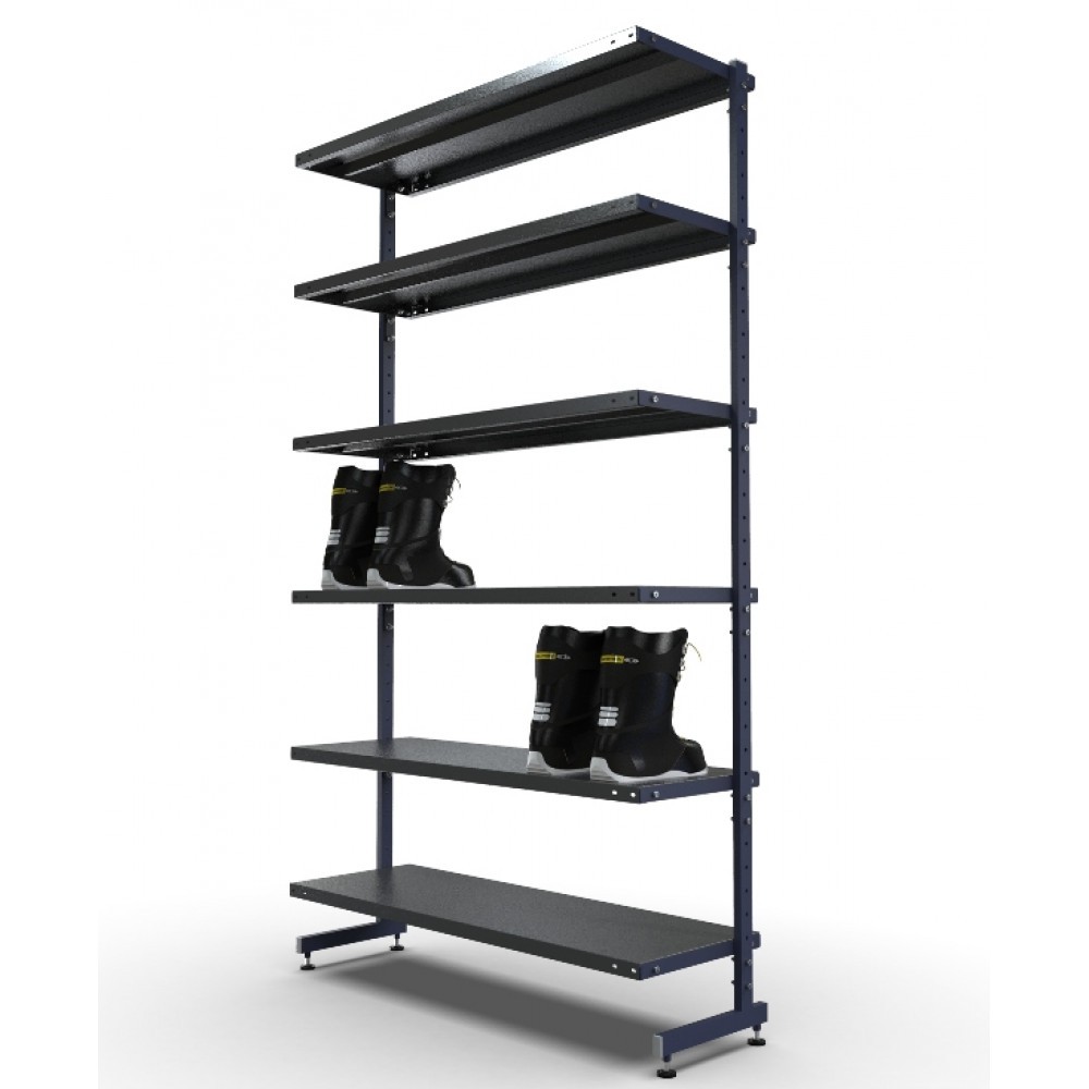 Сборно-разборная конструкция данного стеллажа позволяет значительно экономить затраты при транспортировке. Регулировка полок с шагом в 5 см., позволяет настраивать расстояние между полками под любую высоту ботинка. Так же, для увеличения мест хранения, возможно приобрести дополнительные полки.