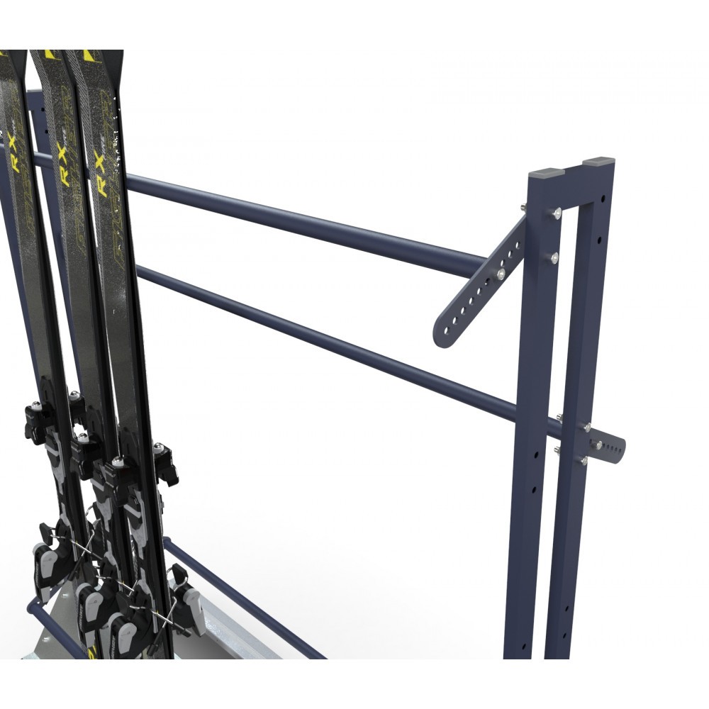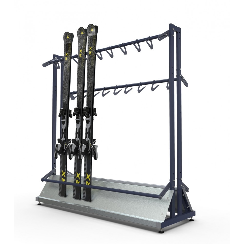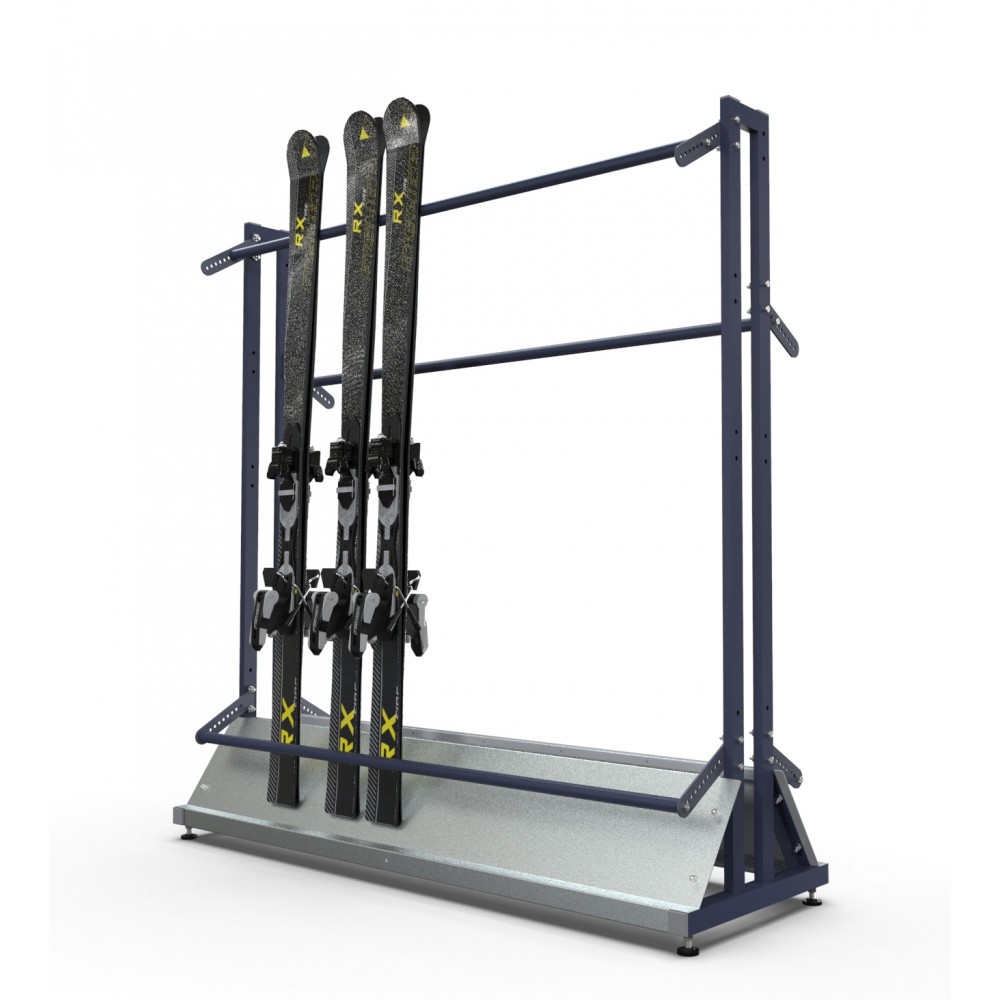 Размещение лыж в данной стойке осуществляется следующим образом: пара лыж складывается скользящей поверхностью друг к другу и устанавливается в стойку. Благодаря данному типу хранения, в стойках возможно размещение горных лыж различных форм, типов и размеров. В одной стойке возможно хранить взрослые и подростковые лыжи.