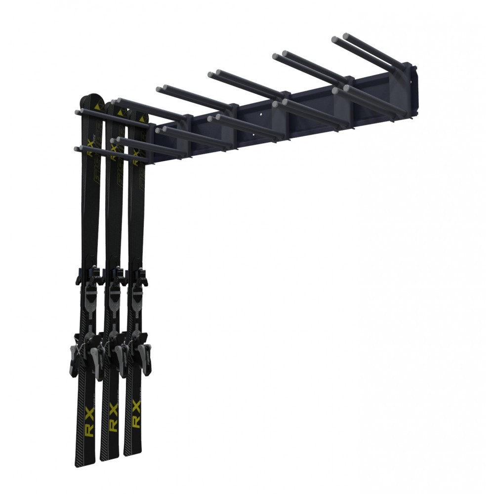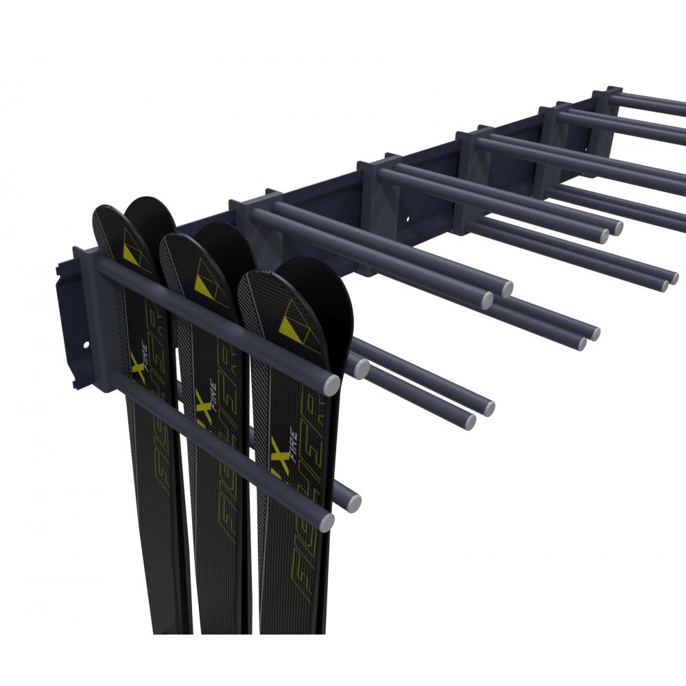 Пристенная вешалка предназначена для хранения горных лыж разной длины с креплениями. Хранение лыж осуществляется следующим образом: пара лыж, скользящей поверхностью складывается друг к другу и устанавливается в держатели-вилки. Держатели лыж (вилки) можно свободно передвигать по горизонтальной поперечине. По желанию Заказчика, вилки можно докупить.