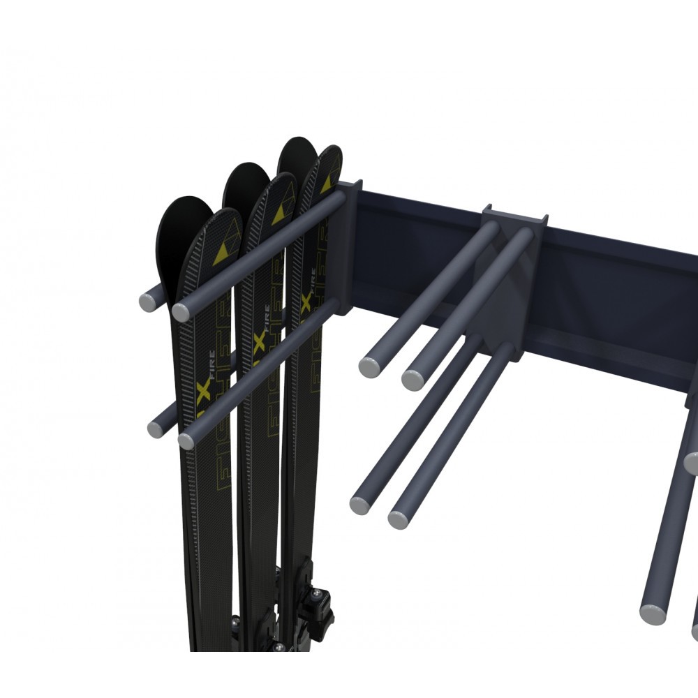 В стандартном исполнении вешалка имеет вместимость: 21/27 пар горных лыж. Вешалка крепится к стене на необходимую высоту. Оборудование окрашивается полимерным порошковым покрытием с высокими защитными и декоративными свойствами. По желанию Заказчика, возможно, покрасить стеллаж в любой цвет по палитре RAL. Так же возможно изготовление вешалки по индивидуальным размерам Заказчика.