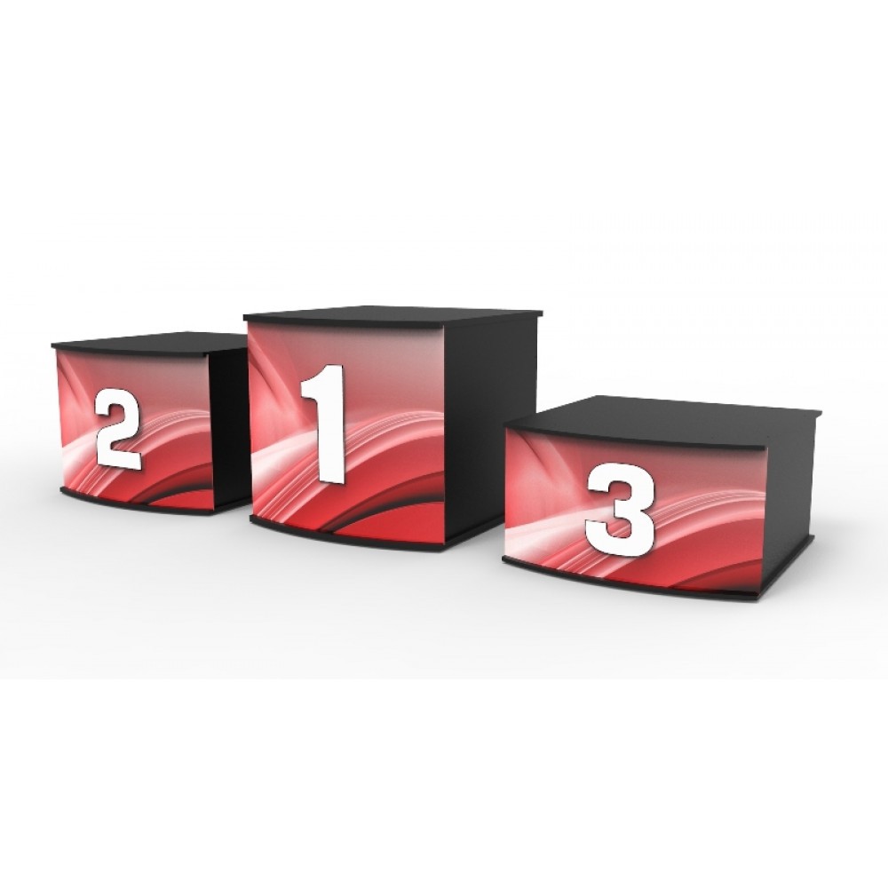 Каркас наградного подиума выполнен из влагостойкой фанеры, толщиной 15 мм. Передняя часть пьедестала имеет облицовку, выполненную из пластика ПВХ толщиной 4 мм., с нанесением полноцветной УФ-печати высокого качества. Пластиковая облицовка съемная - по желанию, Клиент может нанести свое индивидуальное изображение. Более того, смена пластиковой облицовки не требует полной разборки пьедестала. В стандартном исполнении настил пьедестала - ковролин, толщиной 3 мм. Возможен выбор цвета ковролина: серо-черный / зеленый / синий.