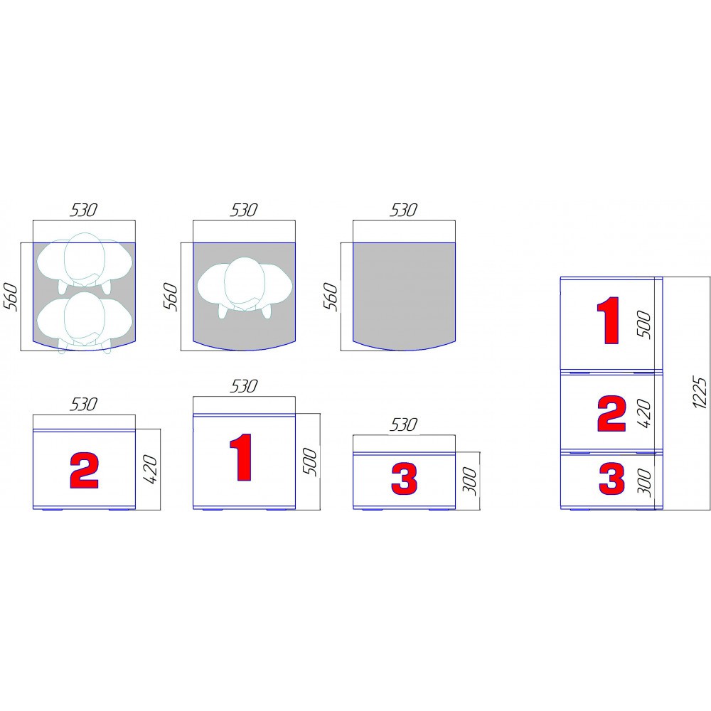 1 место - 530х560х500 мм,