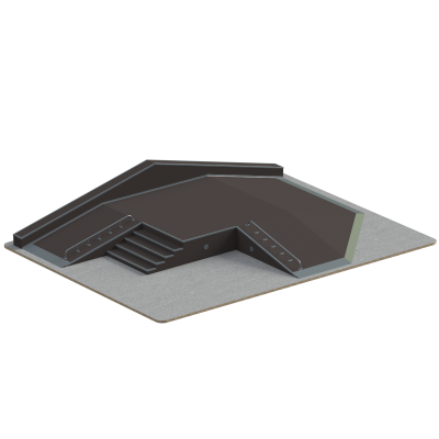 Габариты 12212×9028 мм формируют масштабную рабочую зону, способную стать центральным элементом крупной скейт-площадки. Высота 1941 мм обеспечивает выраженную амплитуду движения и расширяет возможности выполнения сложных элементов.