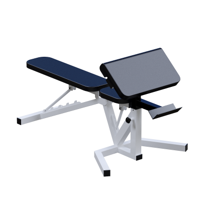 Спинка регулируется в 5 положениях (0°, 20°, 35°, 50°, 65°), сиденье — в 2 положениях (0° и 20°), что позволяет точно подобрать рабочее положение под конкретное упражнение. В комплекте предусмотрены дополнительные съемные модули: парта Скотта и узел сгибания-разгибания ног с посадочной втулкой диаметром 25 мм. Торцы профиля закрыты защитными заглушками.